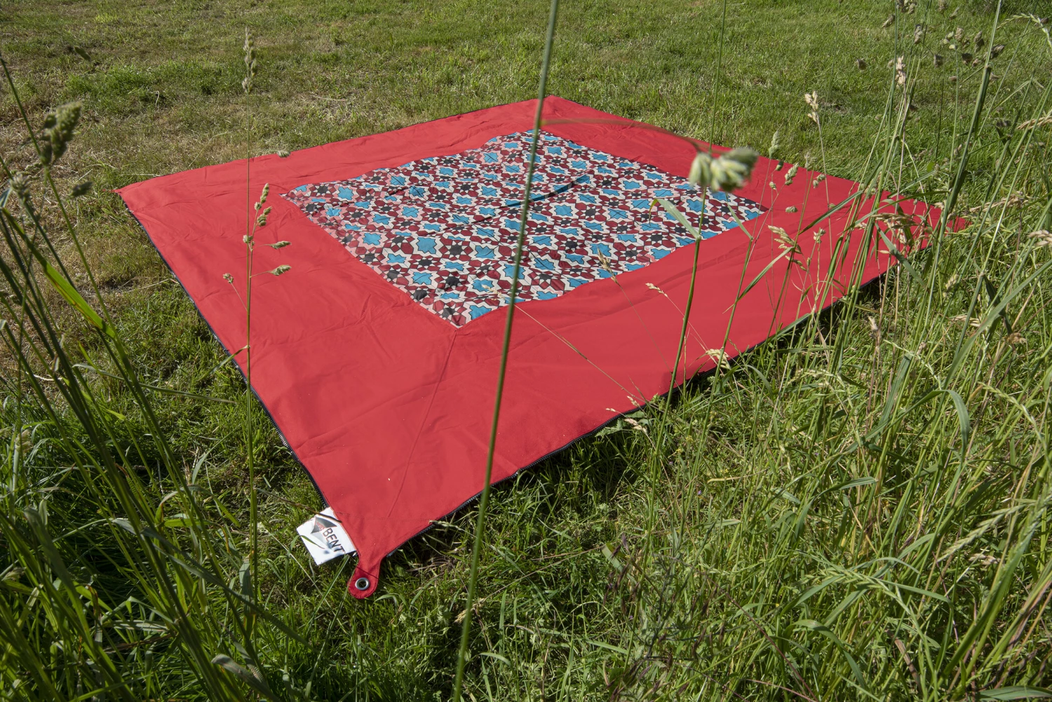 De hoeken zijn voorzien van verstevigde lussen incl. oogjes, zodat u het tapijt ook met haringen in de grond kunt vastzetten. Verpakt in een duurzame koorddraagtas.