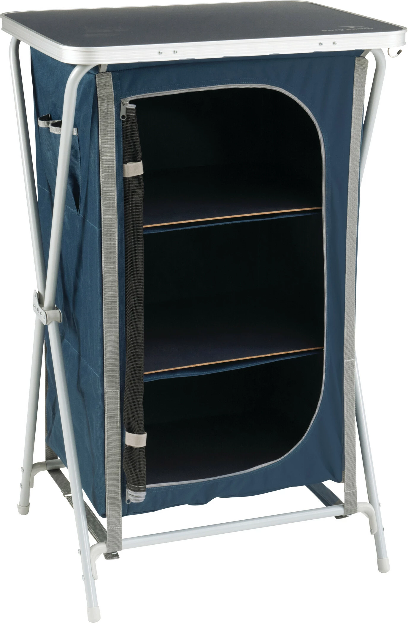 Deze slimme Easy Camp Metz Garderobe is perfect om kleren en andere persoonlijke spullen in op te bergen. De kast heeft een stabiel stalen frame, dat je in een handomdraai openklapt tot een stevige basis voor het tafelblad. De twee planken hebben een gaasdeur, zodat de kleding kan luchten. De dubbele zijvakken en vier haken zijn erg handig voor spullen die je bij de hand wilt houden. Het veelzijdige pakket zit in een compacte draagtas voor transport en opslag.