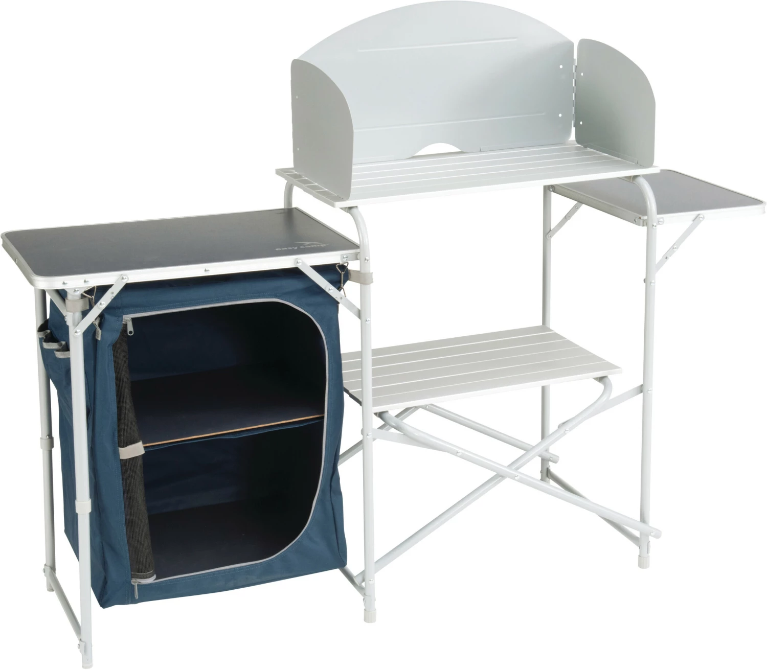 The Easy Camp Sarin kitchen table provides a stable platform for food preparation and cooking as well as the perfect place to store pots, pans, utensils and food close to hand. It features a stable steel frame, side tables, windshield, lower shelf and a cupboard with shelves. The table is simple to set up and packs away neatly into its own carrybag for transport and storage.