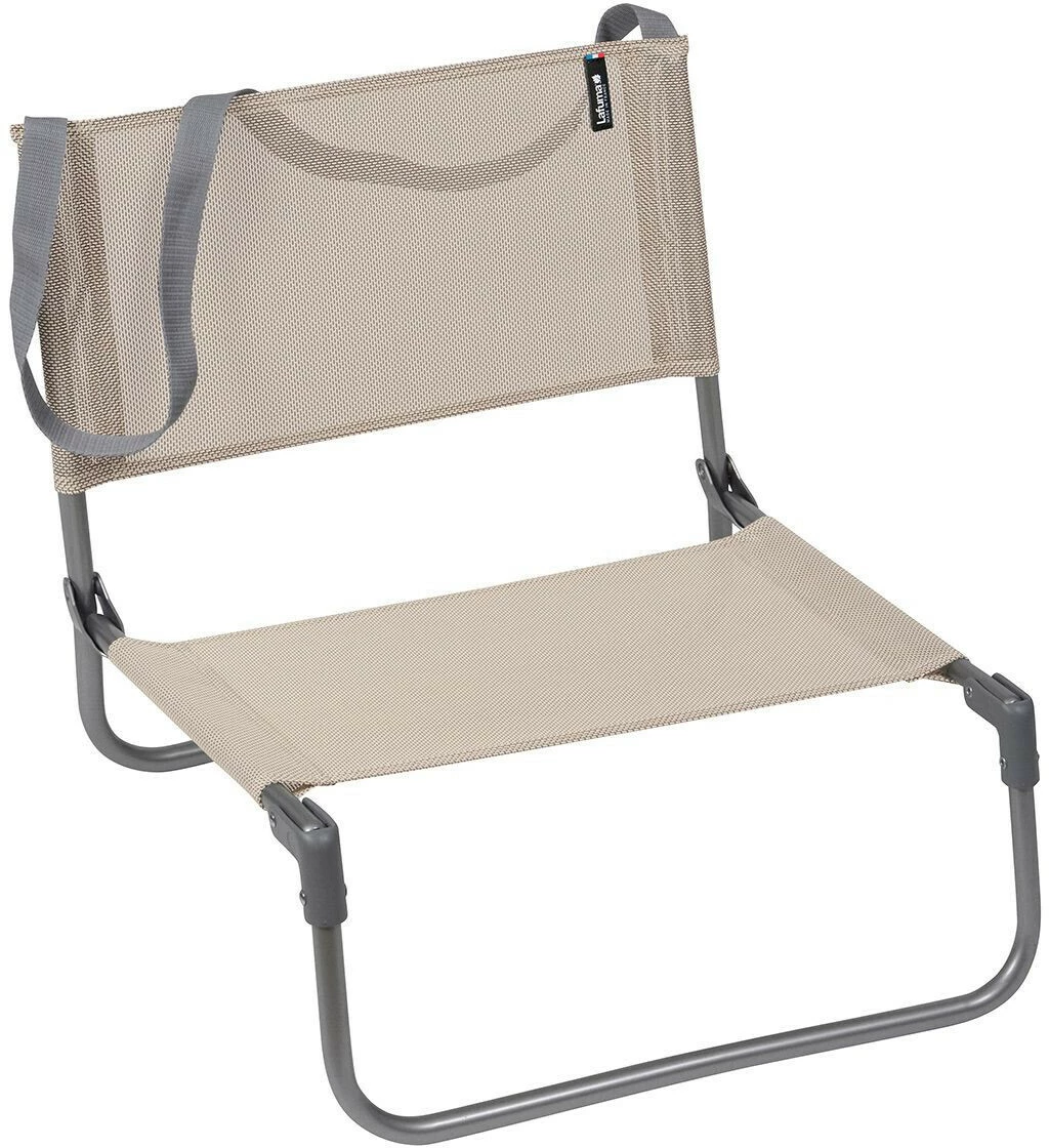 Compact folding low chair. Frame in Ø 16 mm steel tubing with anti-tip and anti-pinching system. Canvas with reinforced stitching. Carrying strap.