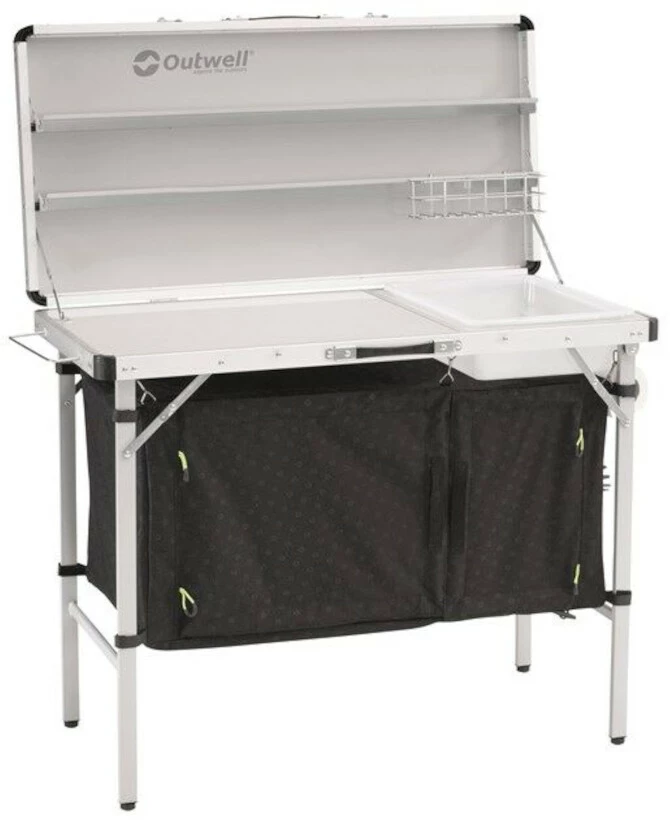 Het chique logopatroon siert de bovenkant, het tafelblad en het bedrukte materiaal van deze keukentafel. Deze tafel vormt niet alleen een stabiele plaats om een maaltijd te bereiden, maar bevat ook gesloten opbergruimte voor pannen, voedingsmiddelen en gas. Hij is makkelijk uit te klappen en ingeklapt neemt hij weinig ruimte in. Koken wordt een stuk aangenamer.