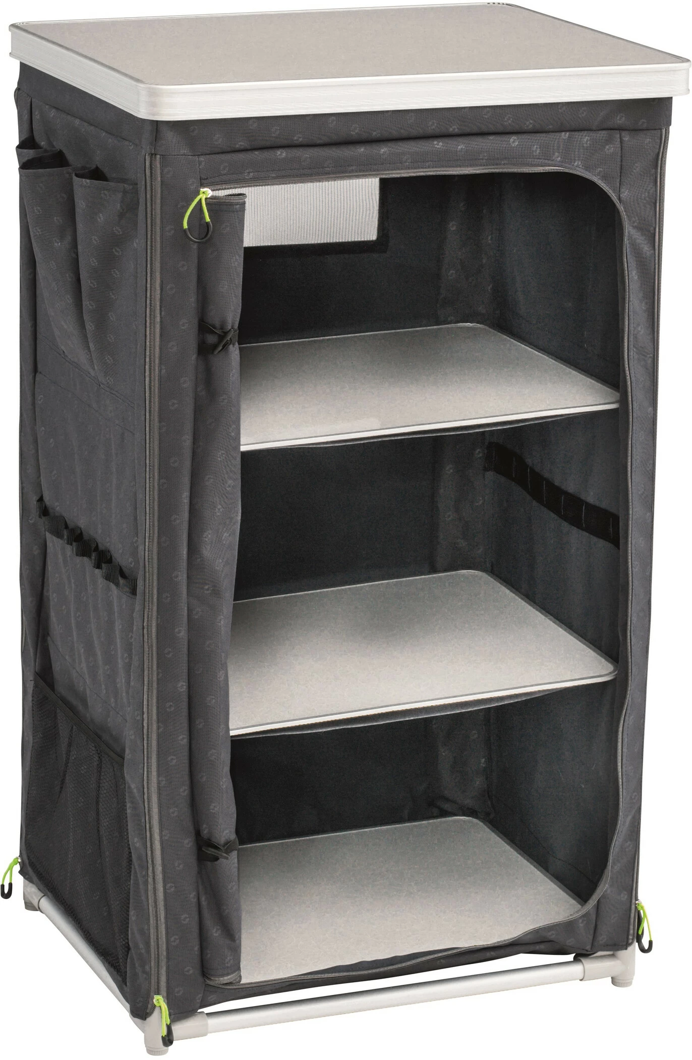 Praktische vouwkast van Outwell met twee legplanken, een deur met ritssluiting en ventilatieopeningen van gaas.