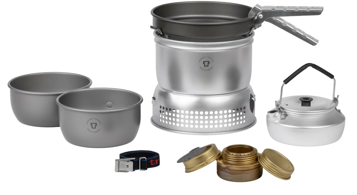 De 27-serie omvat fornuizen voor één of twee personen met kleinere hardgeanodiseerde potten en pannen en een waterkoker. Deze compacte kookset vereist minimale ruimte in de rugzak. Met de houders in de bovenste voorruit opgeklapt, kan het fornuis worden gebruikt met grotere potten uit het Trangia-assortiment.